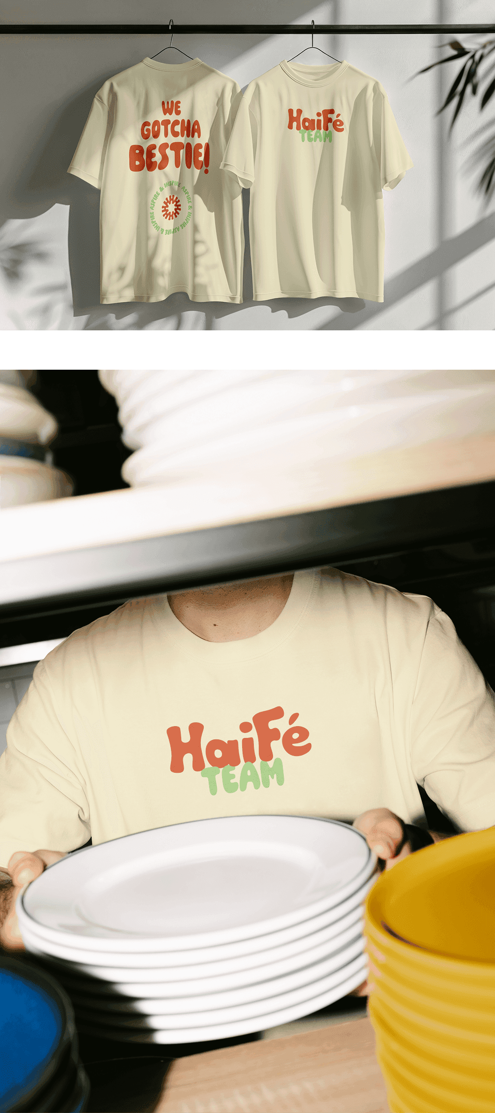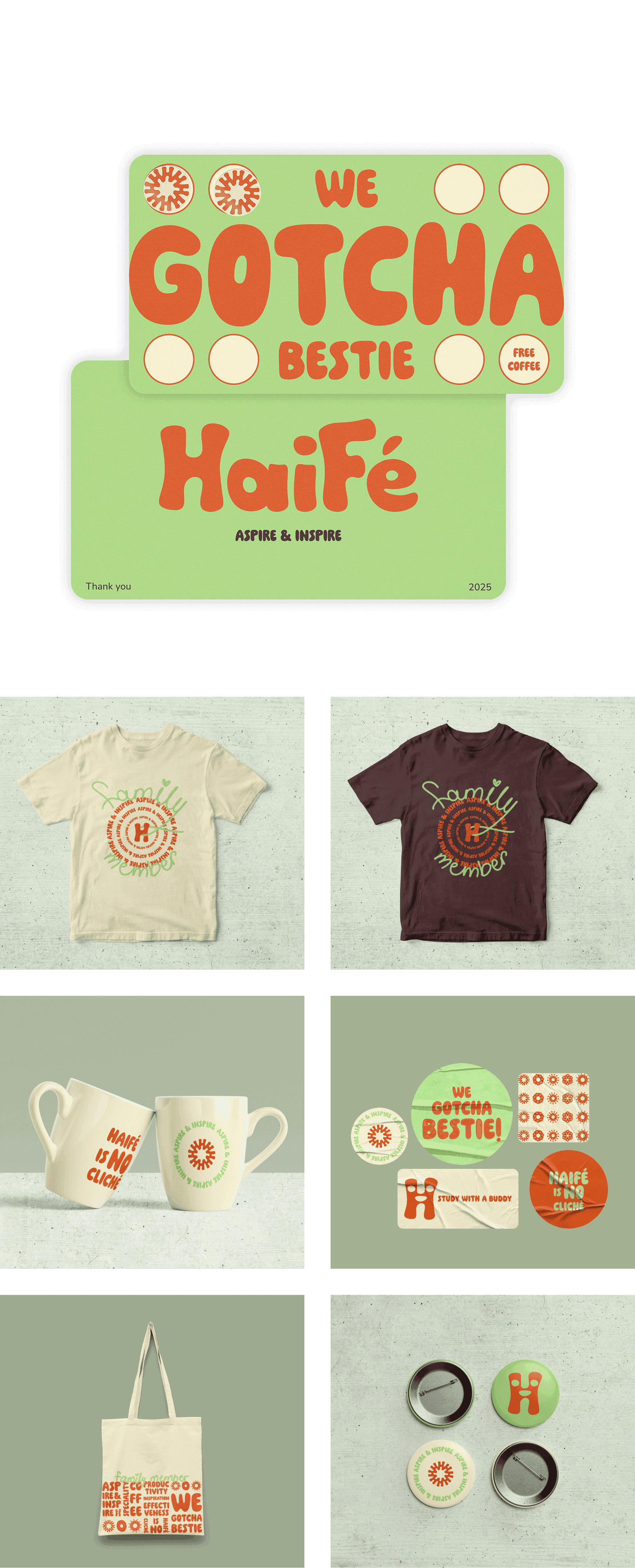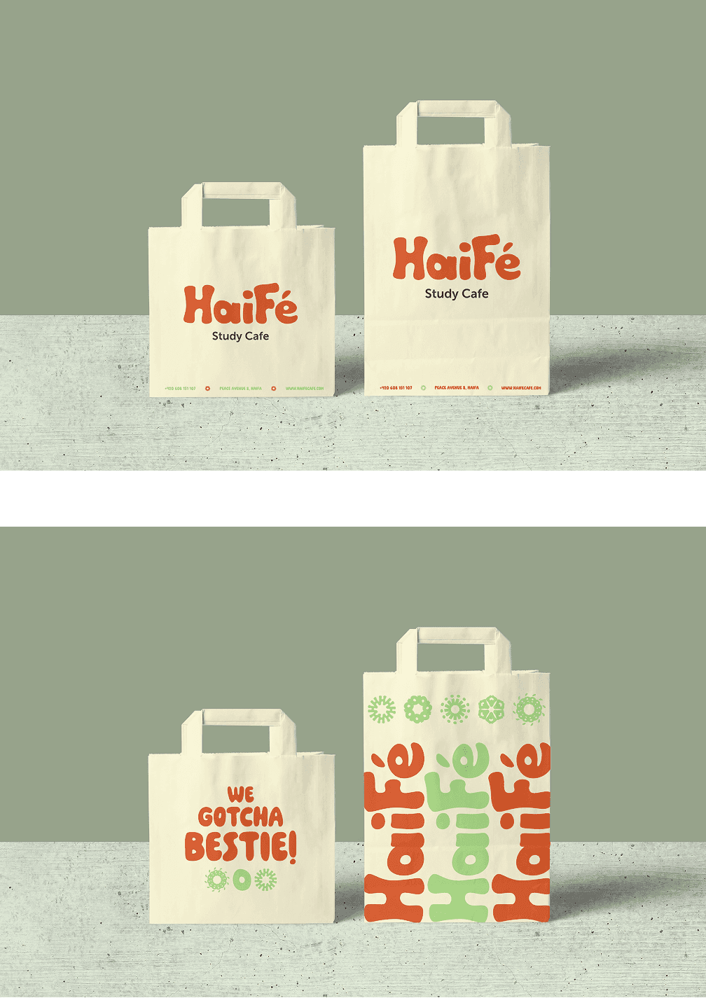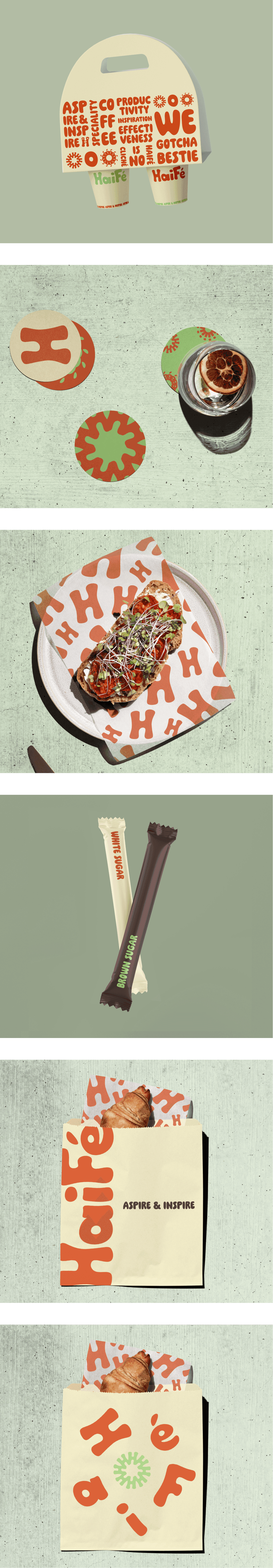 The design focused on building a strong typographic identity complemented by playful brand elements. Each letter of the Haifé logo was transformed into a unique symbol, creating fun patterns. Alongside this, the brand relies on the expressive use of typography—particularly through the chosen typeface, Pain de Mie. Together, these approaches established a cohesive design language centered around typography and visual playfulness.