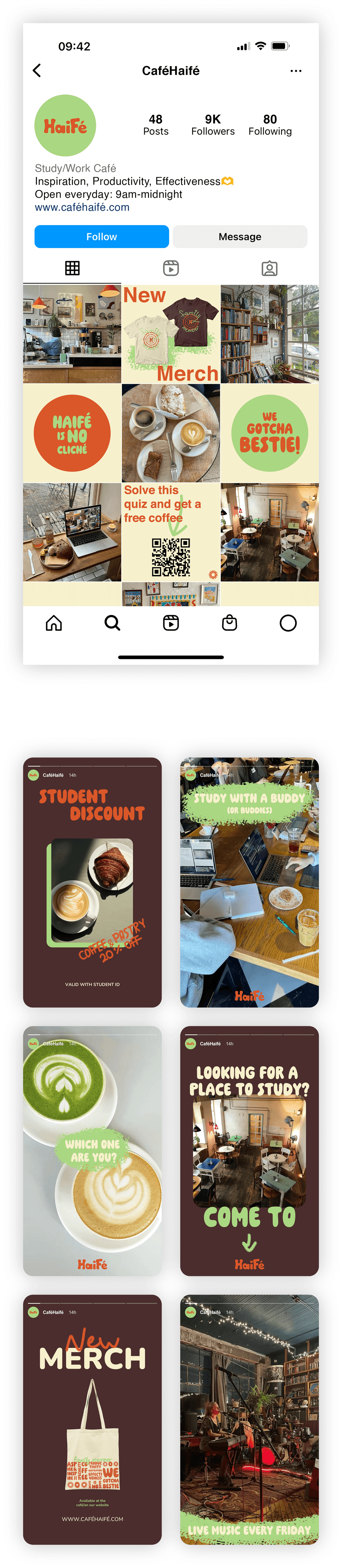 The challenge was to create a distinctive brand identity that would stand out among other places while clearly positioning Haifé as a study and coworking space. The design needed to balance productivity with creativity and inspiration, appealing to both students and people working outside the office.