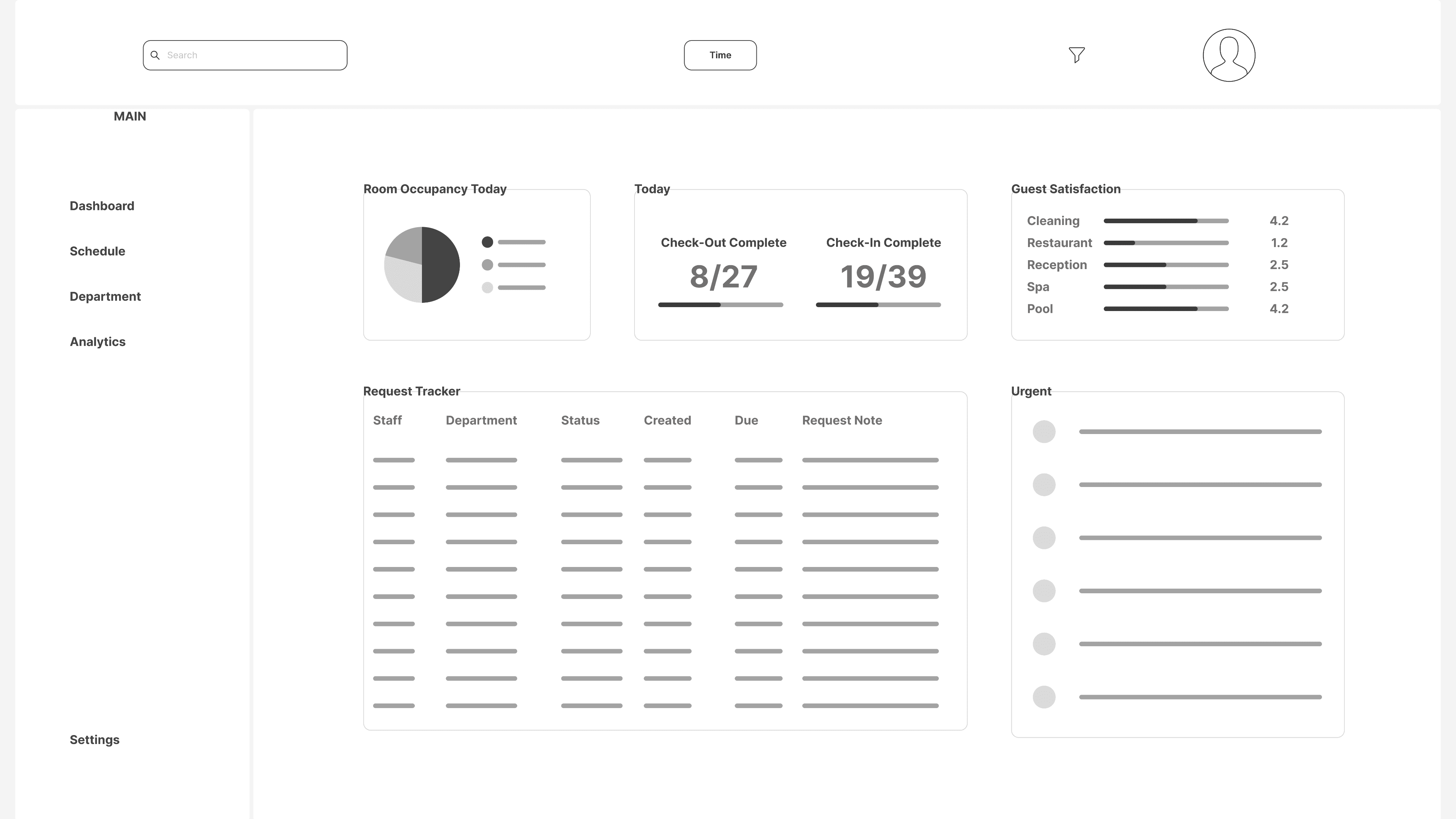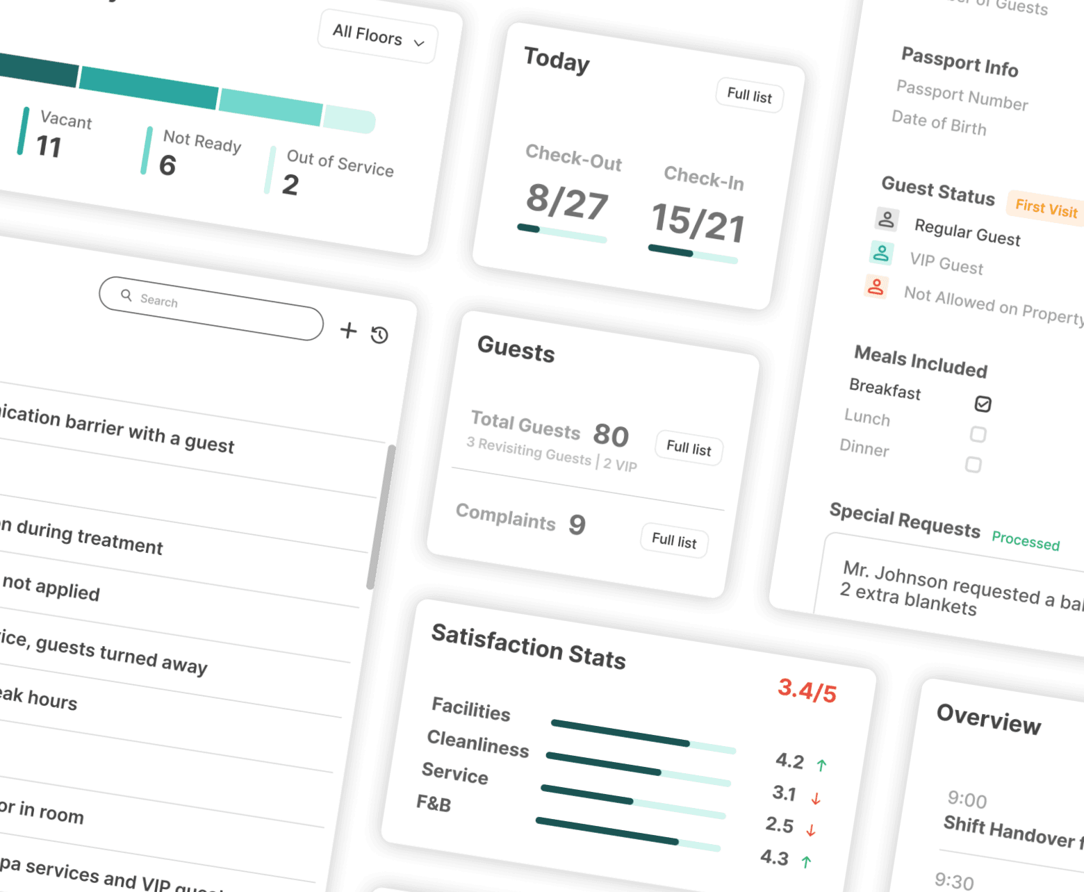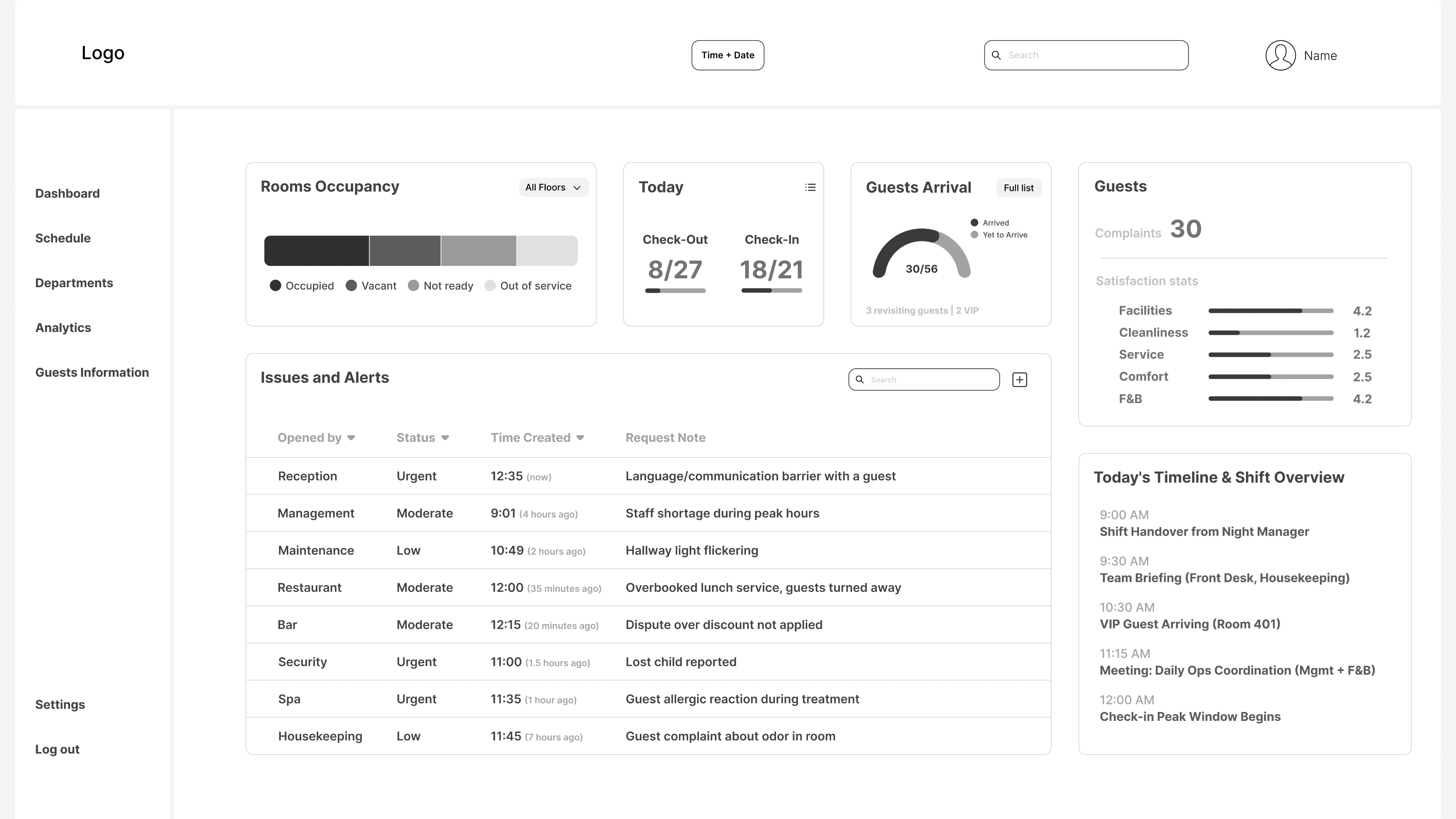 The dashboard serves as the Shift Manager’s central command center, presenting the most essential information needed for quick decision-making, issue resolution, and guest satisfaction. It brings together all critical updates in a layout that balances functionality with a clean aesthetic design.