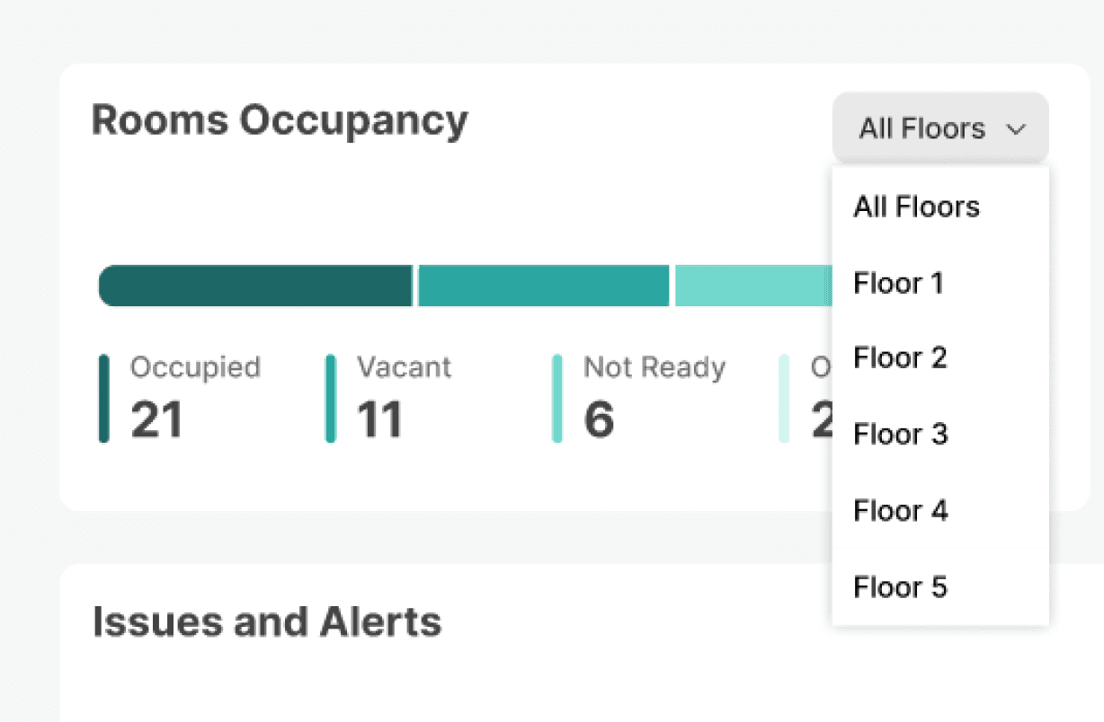 Provides an overview of room status per floor. Allowing the Shift Manager to instantly assess availability and operational readiness.